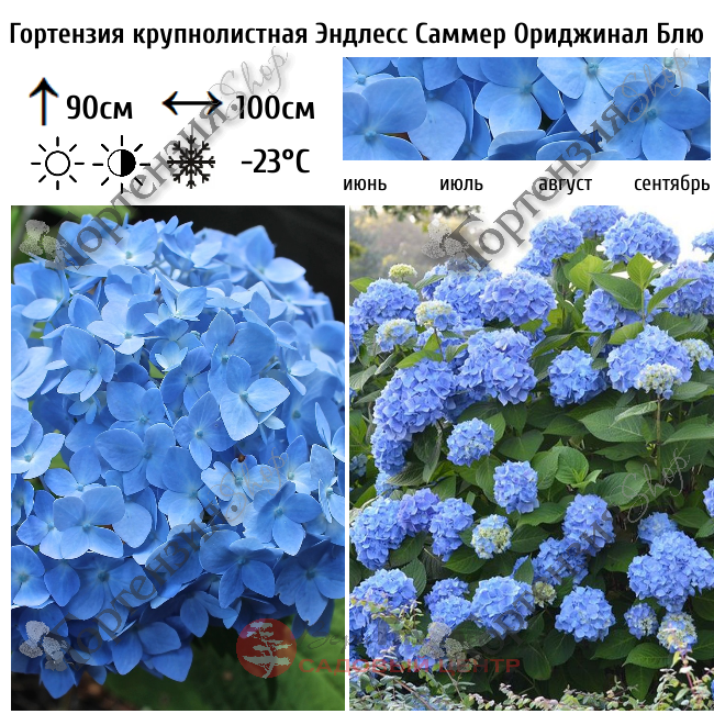 Гортензия крупнолистная Endless Summer ® The Original Blue - первый из сортов гортензии в коллекции. Цветет на одревесневших стеблях прошлого года и на ростках нового сезона. Выносливая, устойчивая к болезням и проверенная временем гортензия.   Original  может цвести как привлекательная голубая гортензия ИЛИ розовая гортензия, при необходимости регулируя уровень pH почвы. Куст средних размеров – 90-110 сантиметров, с широкой кроной. Стебли прочные, ветвистые с большим количество листвы насыщенного зеленого цвета. Период цветения – июнь-сентябрь. Яркие голубые крупные цветочки собраны в плотные шаровидные соцветия. При обрезке после первого цветения растение зацветет повторно. Сорт желательно располагать на солнце либо полутени, на влажных почвах с хорошим дренажом. На зиму требует укрытия.