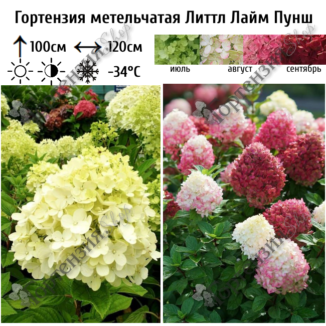 Гортензия метельчатая Литтл Лайм Пунш (Little Lime Punch) - куст густой с плотно набитыми скругленными конусовидными соцветиями, 20 см. Стебли прочные красные. Литл Лайм Пунш начинает цветение в июле лаймовым, постепенно переходя в белый цвет, затем розовеет и к осени становятся насыщенно-розовым, почти красным, цветение продолжается до сентября. Размер куста около 120 см в ширину и 100 см в высоту. Этот компактный сорт подходит для низких живых изгородей, для выращивания в малых садах, как в открытом грунте, так и в кашпо. Морозостойкость до -34°C.
