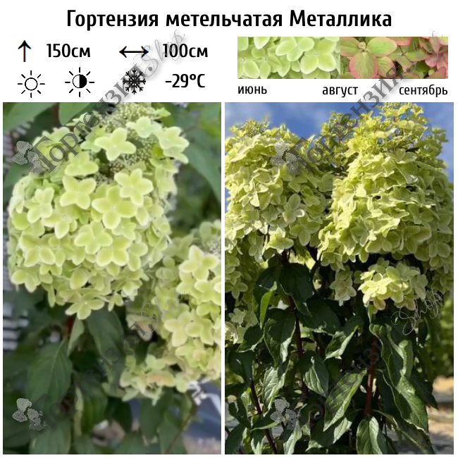 Гортензия метельчатая 'METALLICA' – шедевральная гортензия французкого селекционера Жана Рено - компактный, прямостоячий куст с прочными, мощными побегами, высотой до 150 см, и шириной до 100 см, хорошо держит форму.‘Металлика’ поражает гигантским соцветиями c округлой верхушкой (до 50 см). Лепестки соцветий лаймово-белого цвета, плавно переходят в розовые тона, начиная с кончиков лепестков - вначале образуется розовая кайма, затем заполняется вся поверхность, и в конце цветения приобретает цвет бургундии. Но главная особенность сорта - металлический отблеск лепестков. Такого вы не увидите больше ни у одной гортензии! Отсюда и название сорта "MEТАЛЛИКА"! Цветение с июля по сентябрь. Морозостойкость высокая 4 зона (-34). Эффектна как в группе, так и в одиночной посадке.