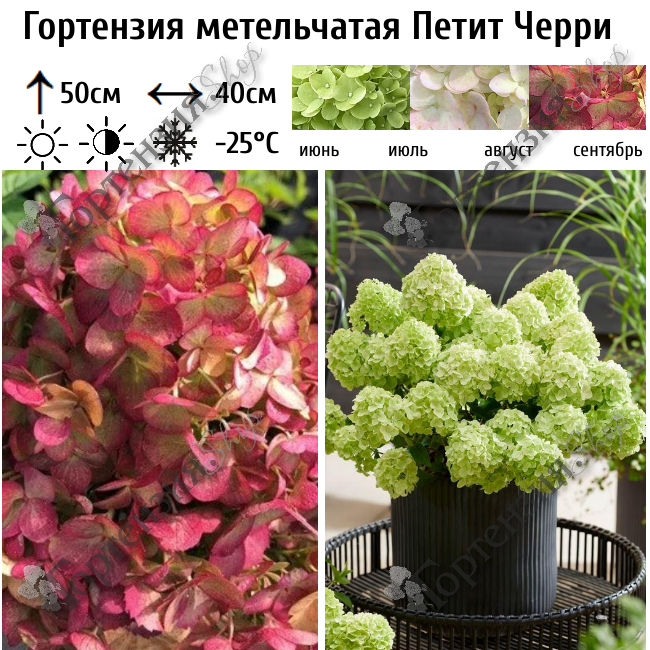Гортензия Петит Черри (Petite Cherry) относятся к карликовым сортам, высотой и шириной 50 см. Листья зеленые, зацветает рано в июне белыми цветами, но уже в июле меняет свою окраску в розовый. Цветет до октября. Хорошо отзывается на подкормки. Подходит для контейнерного выращивания, на террасах, маленьких садах, на срезку, для городского озеленения. Почва должна быть кислая, влажная, но без застоя воды. Зимостойкость-34 С.