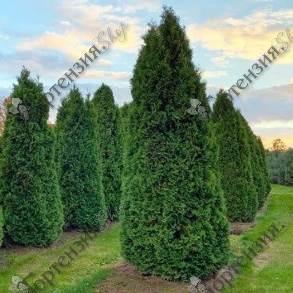 Туя западная (Thuja occidentalis) Колумна - декоративна колоновидной кроной с густой темно-зеленой хвоей высотой до 8 м. Медленнорастущий, годовой прирост около 15 см. Диаметр кроны до 1,5 м, в ширину прирост до 5 см.  Хвоя чешуевидная, густая,  блестящая, темно зеленая.  Зимостойка, морозостойка. Светолюбива, выносит полутень. Предпочитает влажные и плодородные почвы. Используется в качестве солитеров, аллей, изгородей, в композициях с деревьями и кустарниками.