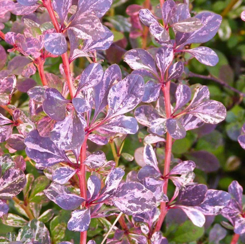 Барбарис Тунберга Фламинго (Berberis thunbergii Flamingo) . Колючий лиственный кустарник с густой округлой кроной. Побеги жесткие, кораллового цвета. Листья темно-пурпурно-серебристо-розовые, с мраморным рисунком розово-серебристого цвета. Цветки  внутри желтые, снаружи красные, собраны в кисти. Цветет в мае. Плоды ярко-красные. Зимостоек. Диаметр кроны взрослого растения: 1,5 м. Высота взрослого растения: 1,5 м.