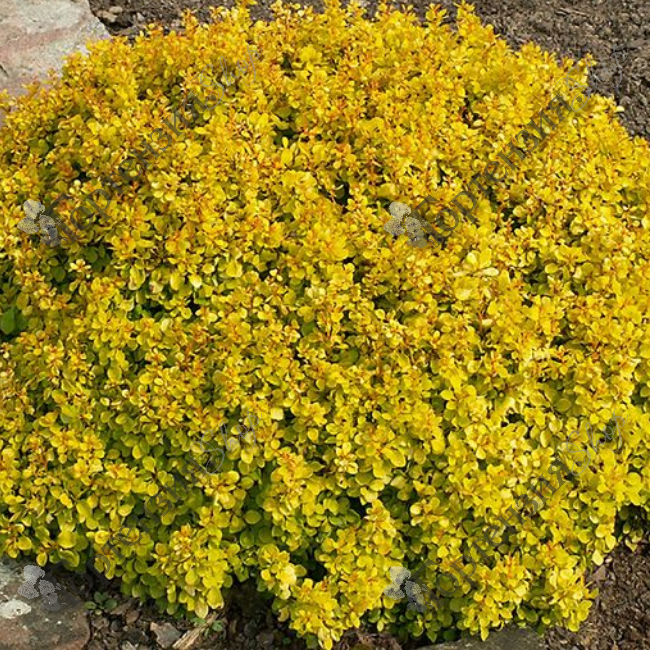 Барбарис Тунберга 'Тини Голд' - медленно растущий карликовый сорт, высотой и шириной  30 см. Окраска светло-желтая,  к осени ярко-оранжевая. Зацветает в мае небольшими  цветками, ягоды красные. Ягоды остаются на ветках и после опадания листвы, а иногда держатся всю зиму.