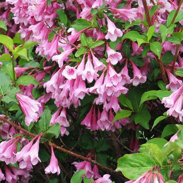 Вейгела 'Bouquet Rose' - плотный декоративный листопадный куст до 2м в высоту. Форма кроны округлая и плотная. Листья эллиптические, ярко-зеленые сверху и светлее с обратной стороны. Цветы собраны в небольшие соцветия, расположенные на верховых и боковых коротких молодых побегах. Цветки извне пурпурно-карминные, внутри - нежно-розовые. Очень частым для 'Bouquet Rose' является повторное цветение. Вейгелы относятся к ценимым садовым декоративным кустарникам из-за низких требований к выращиванию и уходу.
