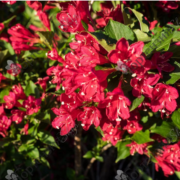 .Вейгела цветущая Люцифер (Weigela florida "Lucifer") - вертикальнорастущий кустарник, побеги слегка свисающие, медленнорастущий. Высота 1,5 м, ширина 1,5 м.Листья ярко-зеленые, эллиптические.Цветки трубчато-воронковидные, бутоны темно-красные, цветки кроваво-красные; цветет в июне. Цветки крупные 3 - 4 см. Цветет в июне, и если провести обрезку побегов, то в конце лета и осенью даст вторую волну цветения.