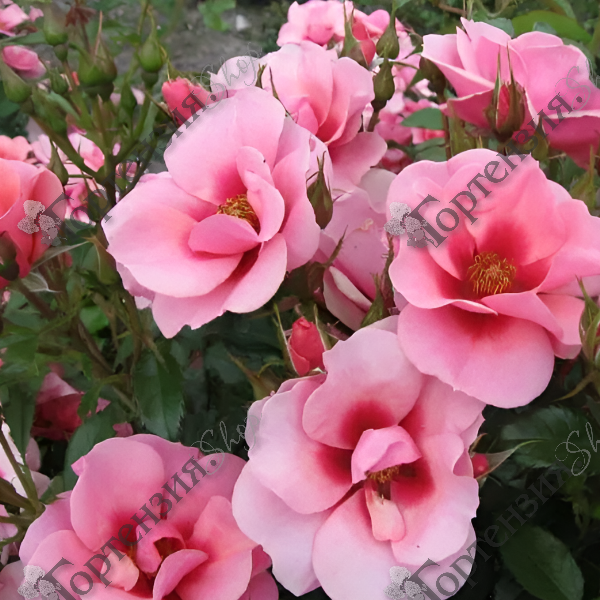 Роза миниатюрная 'Maestro Babylon Eyes' (Rose miniature 'Maestro Babylon Eyes') - Сорт серии 'Babylon Eyes'. Кустарник c компактной, плотной кроной, высотой до 50 см. Листья жесткие, блестящие. Цветение обильное, продолжительное с июня по октябрь. Цветы простые или полумахровые (4-8 лепестков), ярко-розовые с красным глазком по центру, тычинки и пестик выделяются заметно. На солнце лепески выгорат становясь более светлыми. Роза устойчива к заморозкам, засухе и жаре. Почвы предпочитает плодородные, дренированные. Используются в одиночных и групповых посадках, как элемент живой изгороди.