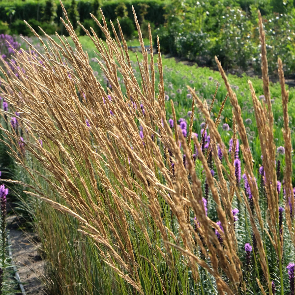 Вейник остроцветковый 'Карл Форстер' (Calamagrostis acutiflora 'Karl Foerster') Вертикальные прочные стебли с зелёными блестящими листьями, сохраняющими свой цвет в течение лета. Крепкие побеги легко выдерживают даже сильные порывы ветра. Метёлки рыхлые, пурпурного цвета, появляются во второй половине июня, в конце августа приобретают золотистый оттенок. Используется в качестве вертикального акцента, эффектного заднего плана в садах и цветниках природного типа,