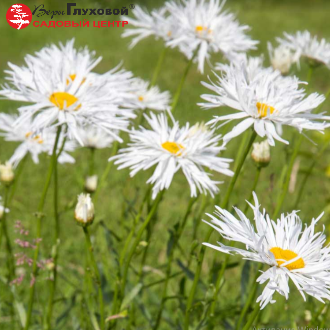 Нивяник великолепный 'Крейзи Дейзи' (Leucanthemum superbum  'Crazy Daisy')Многолетнее цветущее растение высотой до 70 см, шириной до 40 см., листья зеленые, лопастные с зубчатым краем, цветы крупные, полумахровые с тонкими лепестками сравнима разве что с красотой белой хризантемы. Эффектные белоснежные цветы станут ярким фоном для разноцветных соседей. Почвы предпочитает плодородные, без застоя воды место посадки солнечное. Морозостойка.