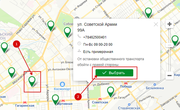 Нажимаем на значок отделения (пункта самовывоза) и выбираем "Забрать здесь" (для "Почта России") или "Выбрать" (для "СДЭК").